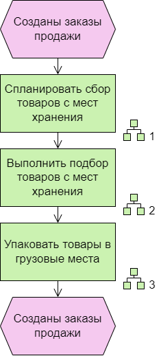 Рассматриваемый процесс разделён на 3 части и имеет инициирущее и завершающее события. Смежные процессы, т.е. инициирующие комплектацию товаров (создание заказа продажи клиенту) и потребляющие его результат (отгрузка грузовых мест в доставку) в данном кейсе не рассматриваются.