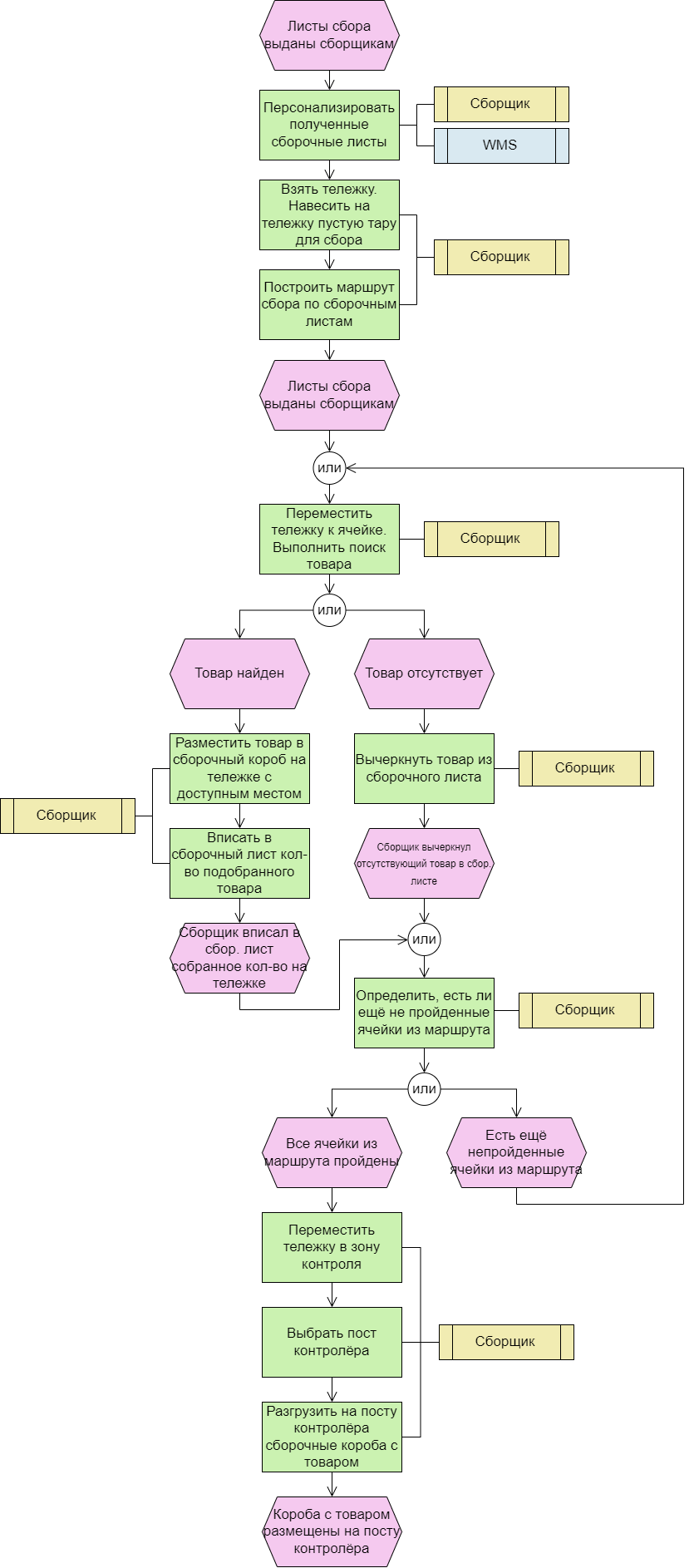 После интервью с сотрудниками, задействованными в процессе комплектации товаров в клиентские заказы был описан консолидированный поток работ, а, затем, сегментирован на агрегированные блоки.