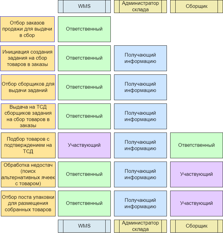 Исходя из вышейказанной матрицы видно, что хоть администратор склада и не управляет процессом, но получает информацию о ходе его реализации на каждом этапе. Поэтому в функциональные требования нужно заложить форму отчётности, а в алгоритме вывода статистики заложить допустимые нормы показателей и границы их критического отклонения.