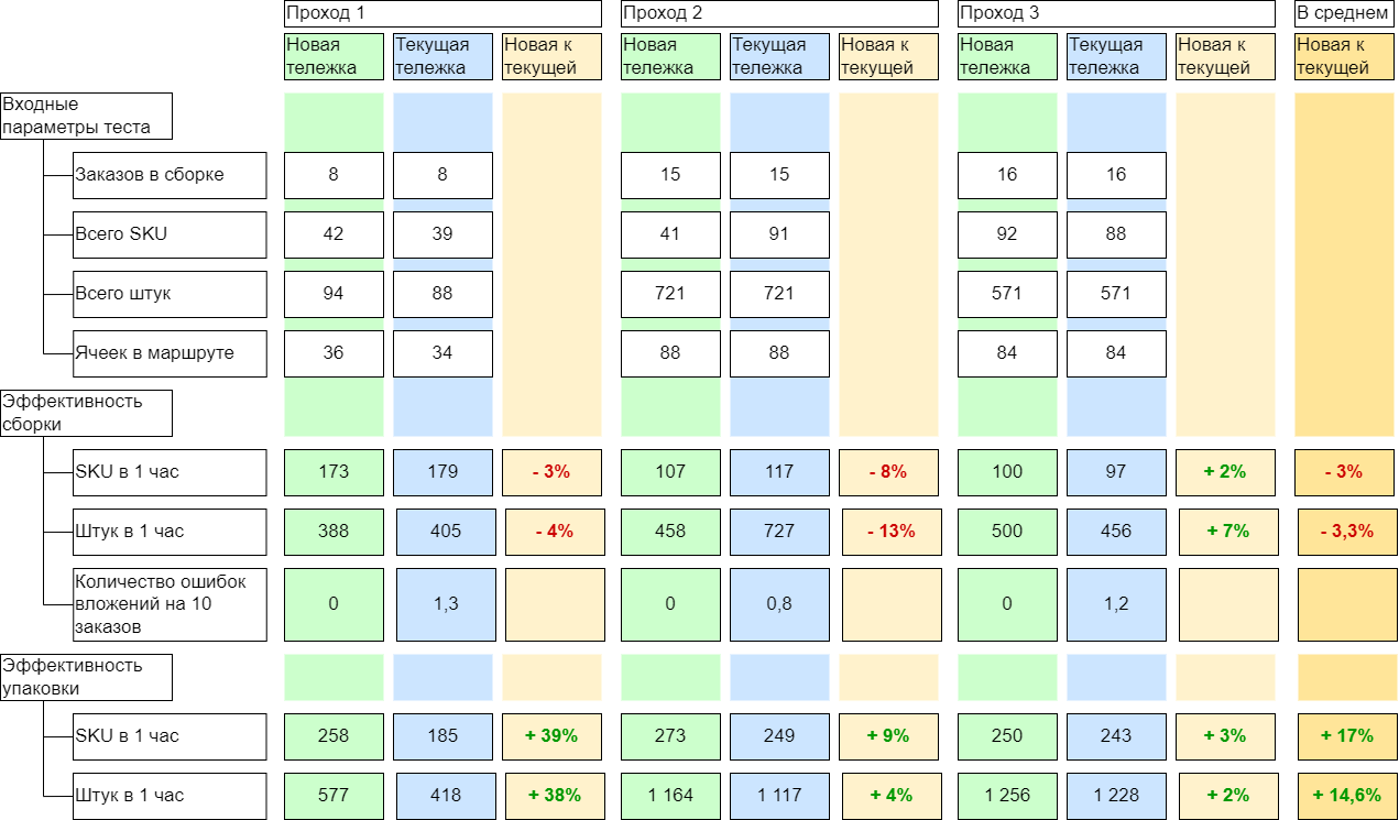 Измерив и сравнив показатели в текущей и целевой технологии можно оценить, есть ли прирост производительности после внедрения автоматизации сбора товаров и применения для этого нового вида тележки.